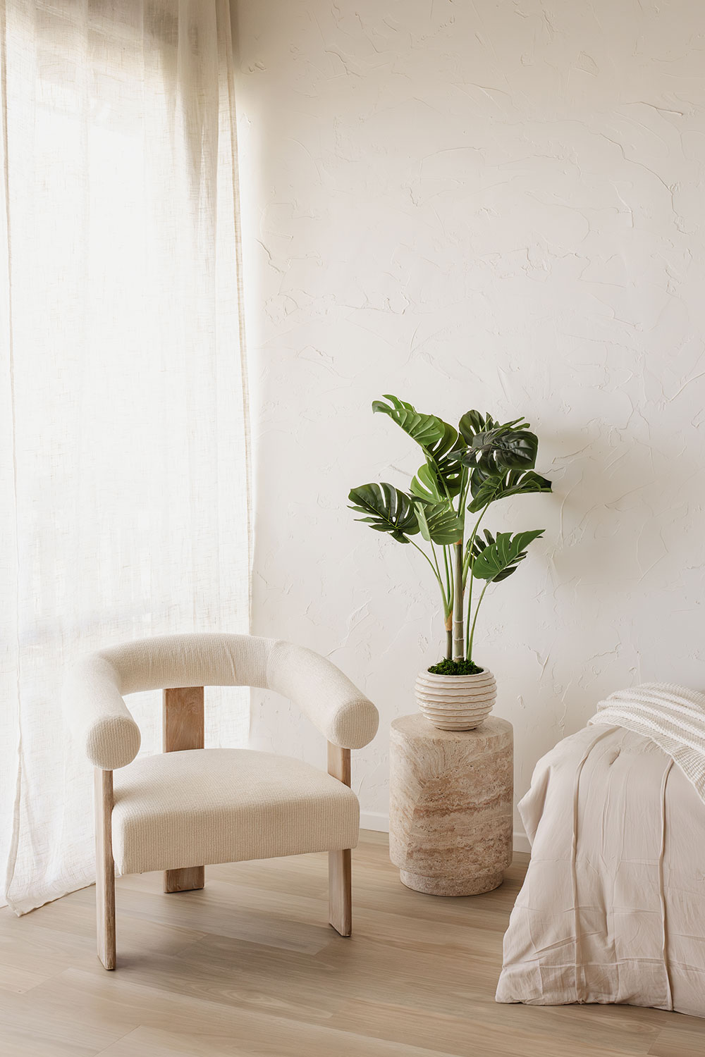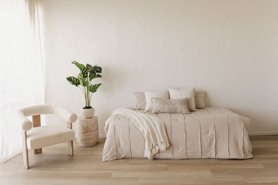 Our Tuscan-inspired space, rich in warm, creamy tones. Soft satin draping against a textured stone wall, paired with a plastered wall, creates depth and an intimate & cozy feel. Perfect for motherhood, boudoir, family sessions, and branding.
